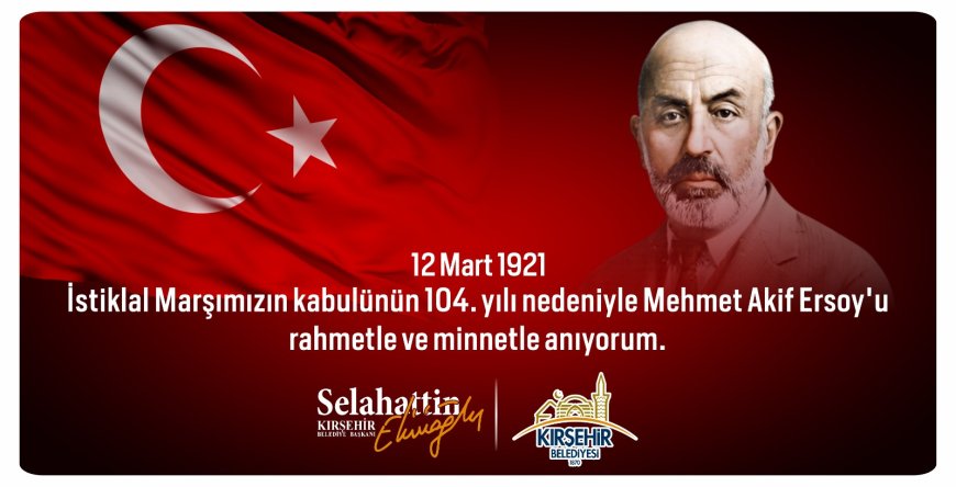 Kırşehir Belediye Başkanı Selahattin Ekicioğlu, İstiklal Marşı’nın kabulünün 104. yıl dönümü dolayısıyla bir mesaj yayımladı. Başkan Ekicioğlu, mesajında İstiklal Marşı’nın milletimizin bağımsızlık ve özgürlük mücadelesinin simgesi olduğunu vurgulayarak, milli şairimiz Mehmet Akif Ersoy’u rahmetle andı.