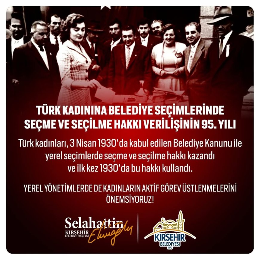 Türk kadını, 3 Nisan 1930'da kabul edilen Belediye Kanunu ile yerel yönetimlerde seçme ve seçilme hakkını kazandı. 95 yıl önce elde edilen bu tarihi hak, kadınların siyasal ve toplumsal hayatta daha etkin bir şekilde yer almasının önünü açtı.