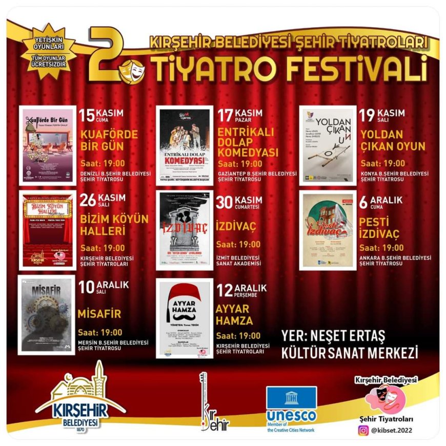 Festival, her yaştan tiyatroseveri kucaklayacak şekilde planlanmış olup, Kırşehir Belediyesi Şehir Tiyatroları'nın yanı sıra, Denizli Büyükşehir Belediyesi Şehir Tiyatrosu, Gaziantep Büyükşehir Belediyesi Şehir Tiyatrosu, Konya Büyükşehir Belediyesi Şehir Tiyatrosu, İzmit Belediyesi Şehir Tiyatrosu, Ankara Büyükşehir Belediyesi Şehir Tiyatrosu ve Mersin Büyükşehir Belediyesi Şehir Tiyatrosu gibi büyük şehirlerin tiyatro ekipleri de Kırşehirli seyircilerle buluşacak.