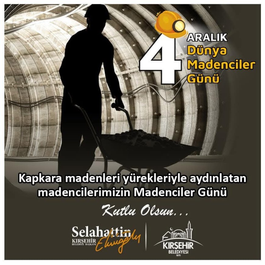 "Kırşehir Belediye Başkanı Selahattin Ekicioğlu'ndan 4 Aralık Dünya Madenciler Günü Mesajı:Kapkara Madenleri Yürekleriyle Aydınlatan Madencilerimizin Madenciler Günü Kutlu Olsun."