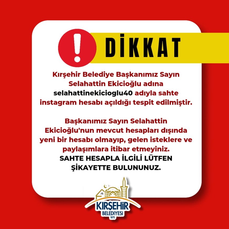 Kırşehir Belediye Başkanlığı, Belediye Başkanı Sayın Selahattin Ekicioğlu adına "selahattinekicioglu40" kullanıcı adıyla sahte bir Instagram hesabının açıldığını tespit ederek kamuoyunu bilgilendirdi.