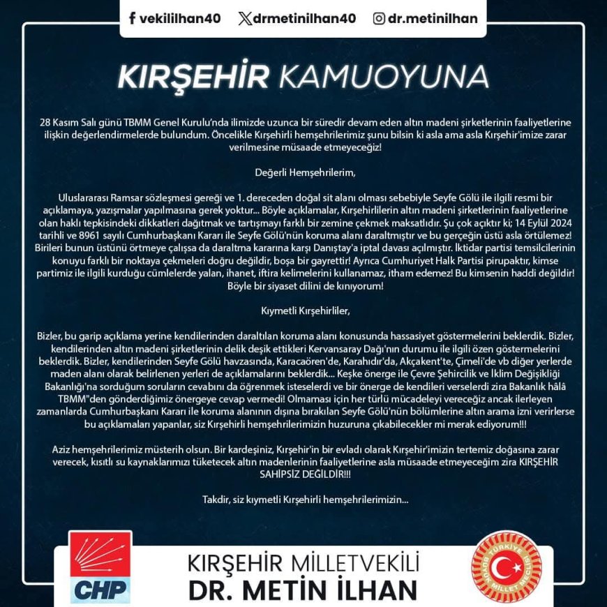 Özellikle Seyfe Gölü konusunda yapılan yanlış ve yanıltıcı açıklamalara karşı kamuoyunu bilgilendirmek istiyorum. Seyfe Gölü, Uluslararası Ramsar Sözleşmesi gereği korunan bir alan olup, aynı zamanda 1. dereceden doğal sit alanı statüsüne sahiptir. Bu nedenle, Seyfe Gölü ile ilgili resmi bir açıklama yapmaya gerek yoktur. Ancak, bazı kesimler, bu konuyu başka bir zemine çekmeye çalışarak Kırşehir halkının altın madeni şirketlerine karşı haklı tepkisini saptırmak istemektedir. Bizler, Kırşehirliler olarak bu tür spekülasyonların farkındayız.