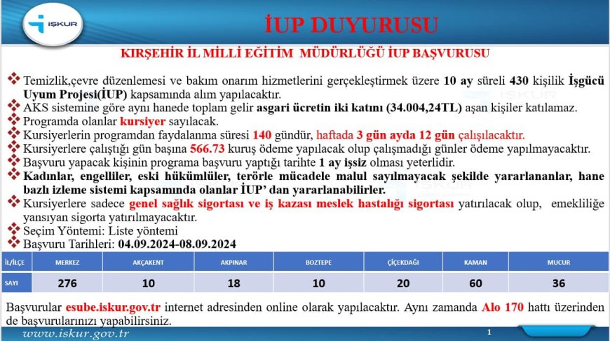Türkiye İş Kurumu (İŞKUR) ve Millî Eğitim Bakanlığı iş birliğiyle başlatılan İşgücü Uyum Programı (İUP) kapsamında, ilk programlar 81 ilde toplamda 120.000 kontenjanla açıldı. 4 Eylül itibarıyla başvuruların başladığı programlara İŞKUR e-şube, Alo170, Çalışma ve İş Kurumu İl Müdürlükleri ve İŞKUR Hizmet Merkezleri üzerinden başvuru yapılabiliyor.