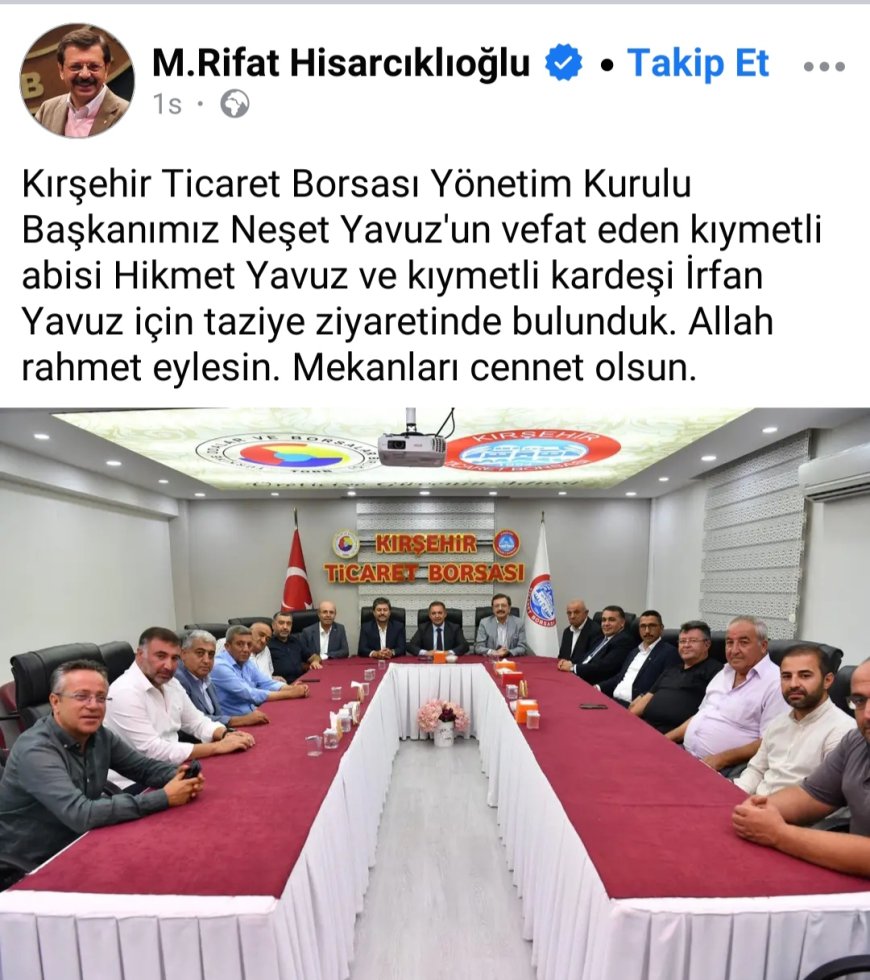 Türkiye Odalar ve Borsalar Birliği (TOBB) Başkanı M. Rifat Hisarcıklıoğlu, Kırşehir Ticaret Borsası Yönetim Kurulu Başkanı Neşet Yavuz'un vefat eden ağabeyi Hikmet Yavuz ve kardeşi İrfan Yavuz için taziye ziyaretinde bulundu. Hisarcıklıoğlu, Yavuz ailesine başsağlığı dileyerek, “Allah rahmet eylesin. Mekanları cennet olsun” dileklerinde bulundu.