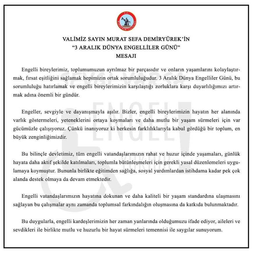3 Aralık Dünya Engelliler Günü, yalnızca bir hatırlatma değil, engelli bireylerimize daha iyi bir dünya inşa etme adına atacağımız adımların başlangıcıdır. VALİMİZİN MESAJI: " YANLARINDAYIZ "