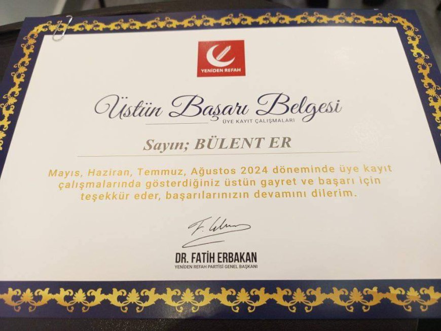 Bülent Er, Kırşehir İl Başkanı olarak yaptığı açıklamada, “Yeniden Refah Partisi olarak, şehrimizin ve ülkemizin kalkınması için yoğun bir çaba içinde bulunuyoruz. Bugüne kadar gerçekleştirdiğimiz projeler ve faaliyetlerle hem partimizi güçlendirdik hem de halkımıza en iyi hizmeti sunmak için elimizden geleni yaptık. Genel Başkanımız Dr. Fatih Erbakan'dan aldığımız bu belge, ekibimizin özverisinin ve gayretinin bir göstergesidir” dedi.